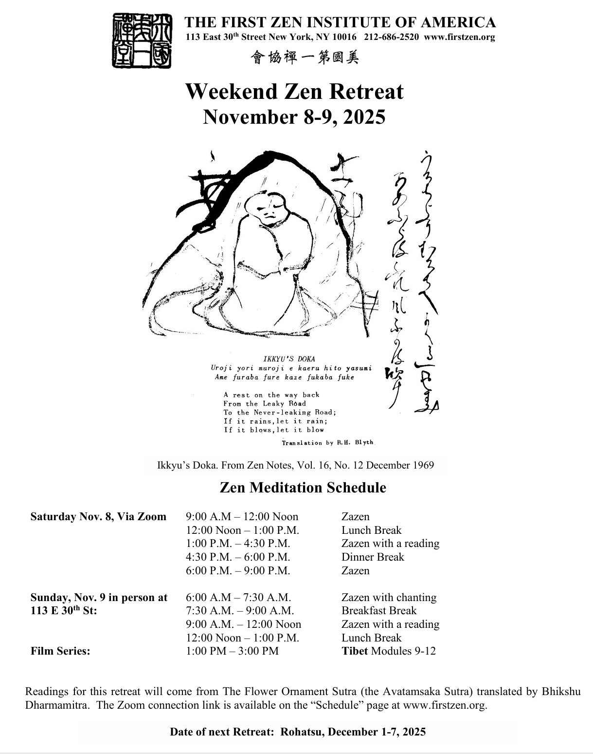 8:00 - 9:00 Sitting (with chanting, kinhin and reading) in Zendo